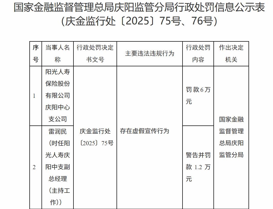 10月29日,国家金融监管总局庆阳监管分局行政处罚信息公示表显示,阳光人寿保险股份有限公司庆阳中心分公司因虚假宣传被罚款6万元;阳光人寿庆阳中心支公司副总经理(主持工作)雷某民受到警告,并罚款12000元。